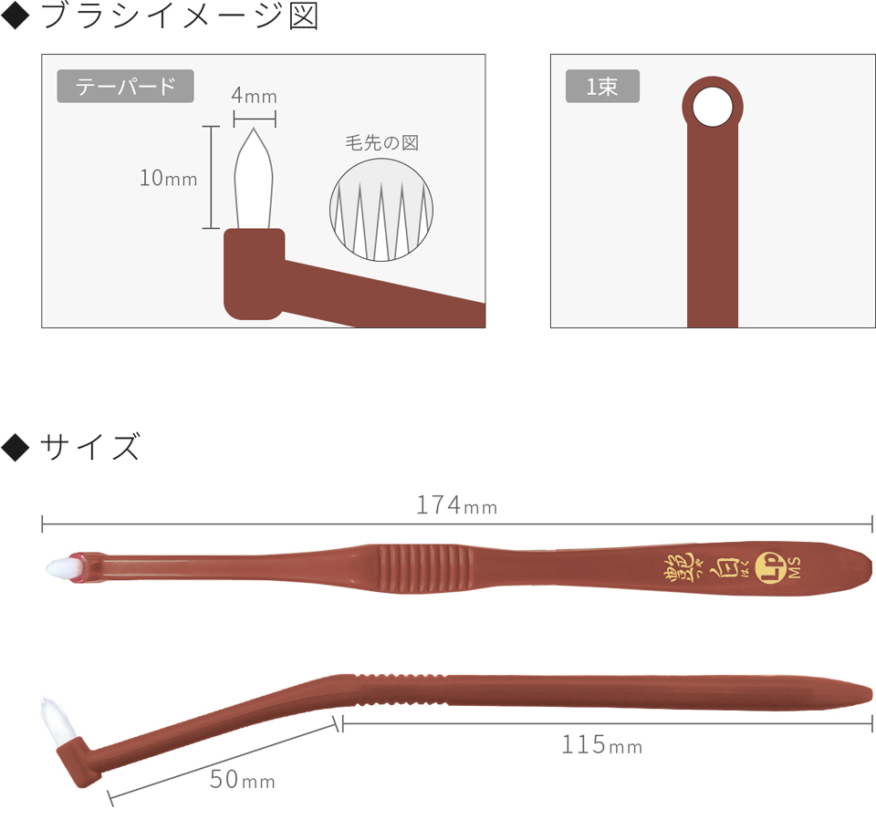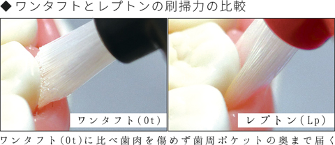 部分的に細かく磨けるテーパード毛を使ったレプトン歯ブラシはピンポイントで磨いても歯肉にダメージを与えない優しい先細ワンタフト。